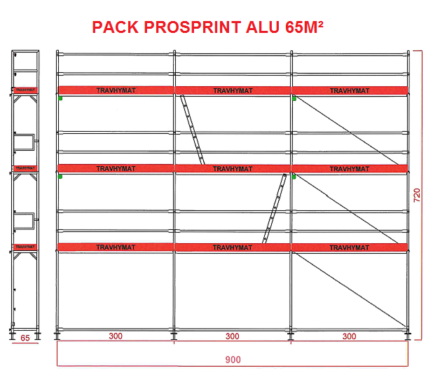 • Pack 87m² de surface d'échafaudage (= 100m² surface de travail) : Longueur 12 m x hauteur plancher 6,20m