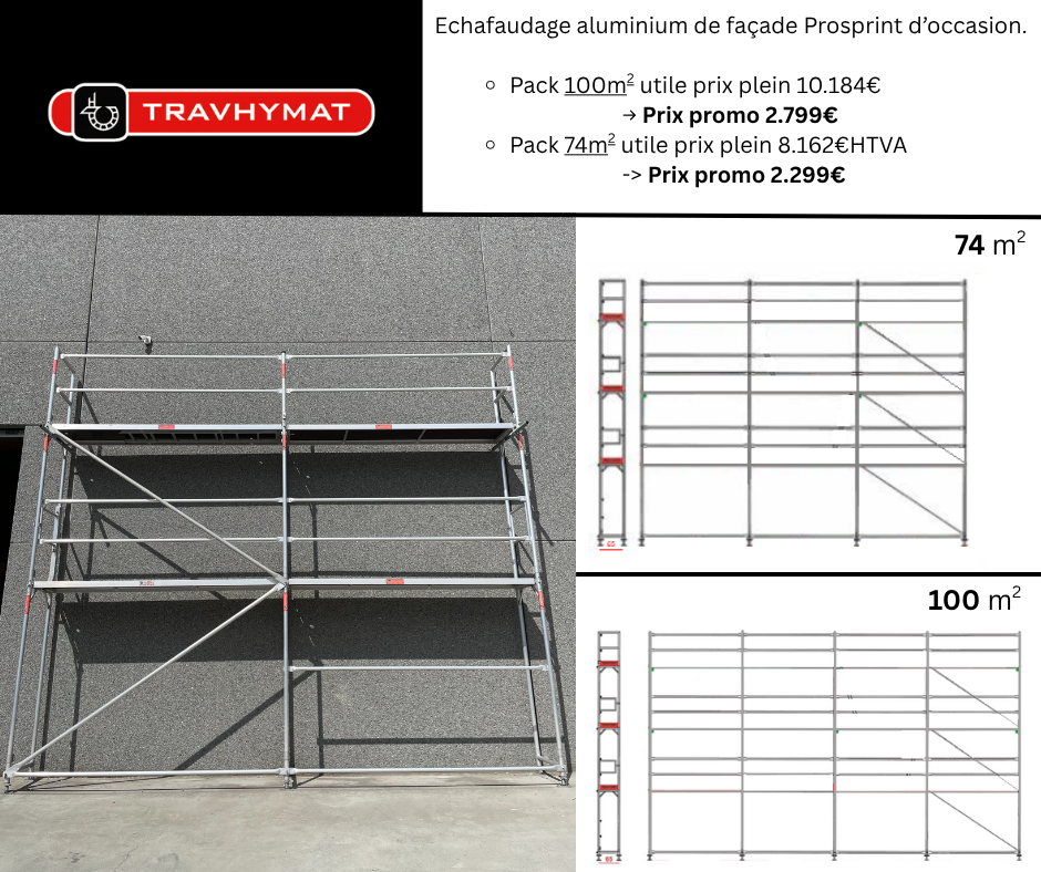 Le pack d'échafaudage Prosprint est actuellement en promotion chez Travhymat. Pack 100 m² utile et Pack 74 m² utile à prix canons. Ne ratez pas cette opportunité.